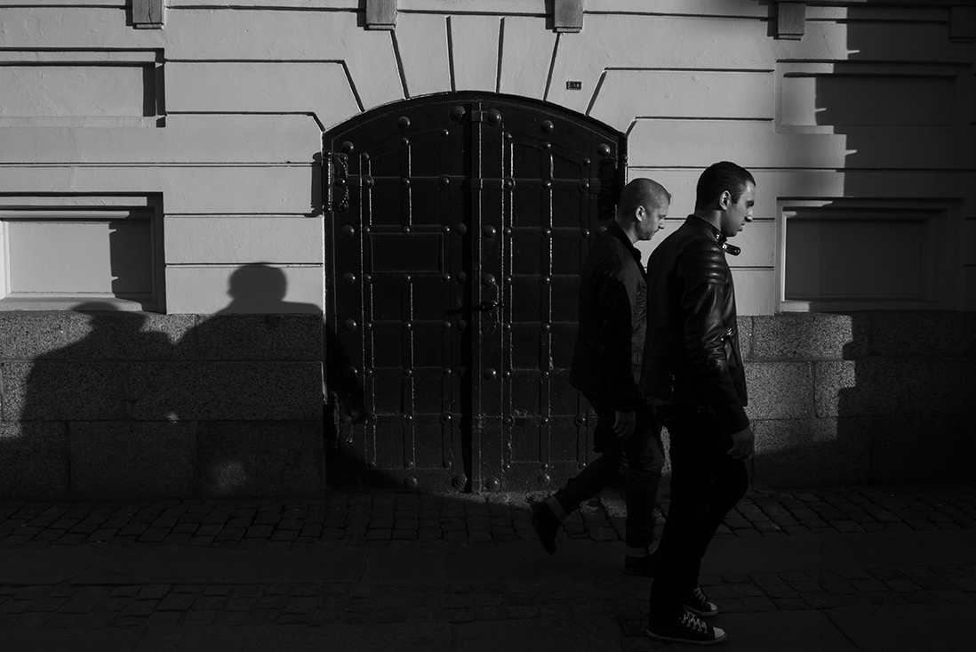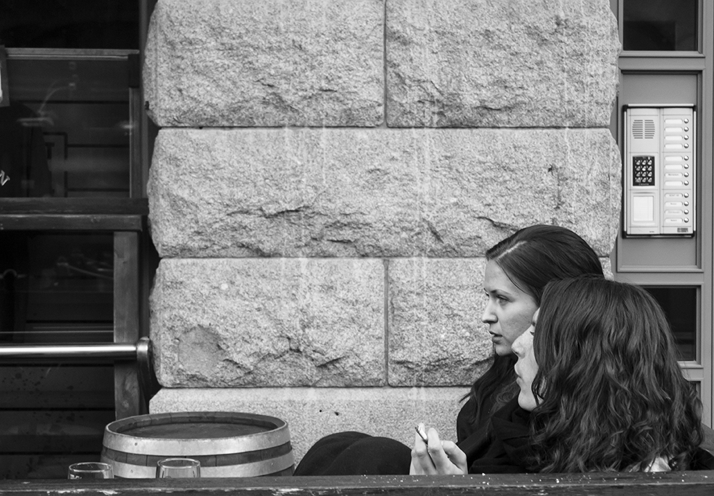 Took a walk with a friend yesterday. We went out a bit too late, the sun was already setting, but I got these two shots with my little Panasonic GX-1. The first shot I liked because of the shadows casting on the wall and behind the people. The second shot is just of two girls sitting outside a pub smoking. 😉